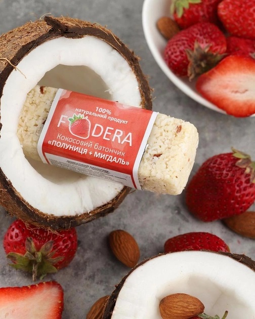 Склад: кокосова м’якоть сушена, мед натуральний, мигдаль сушений, полуниця сушена, морська сіль.