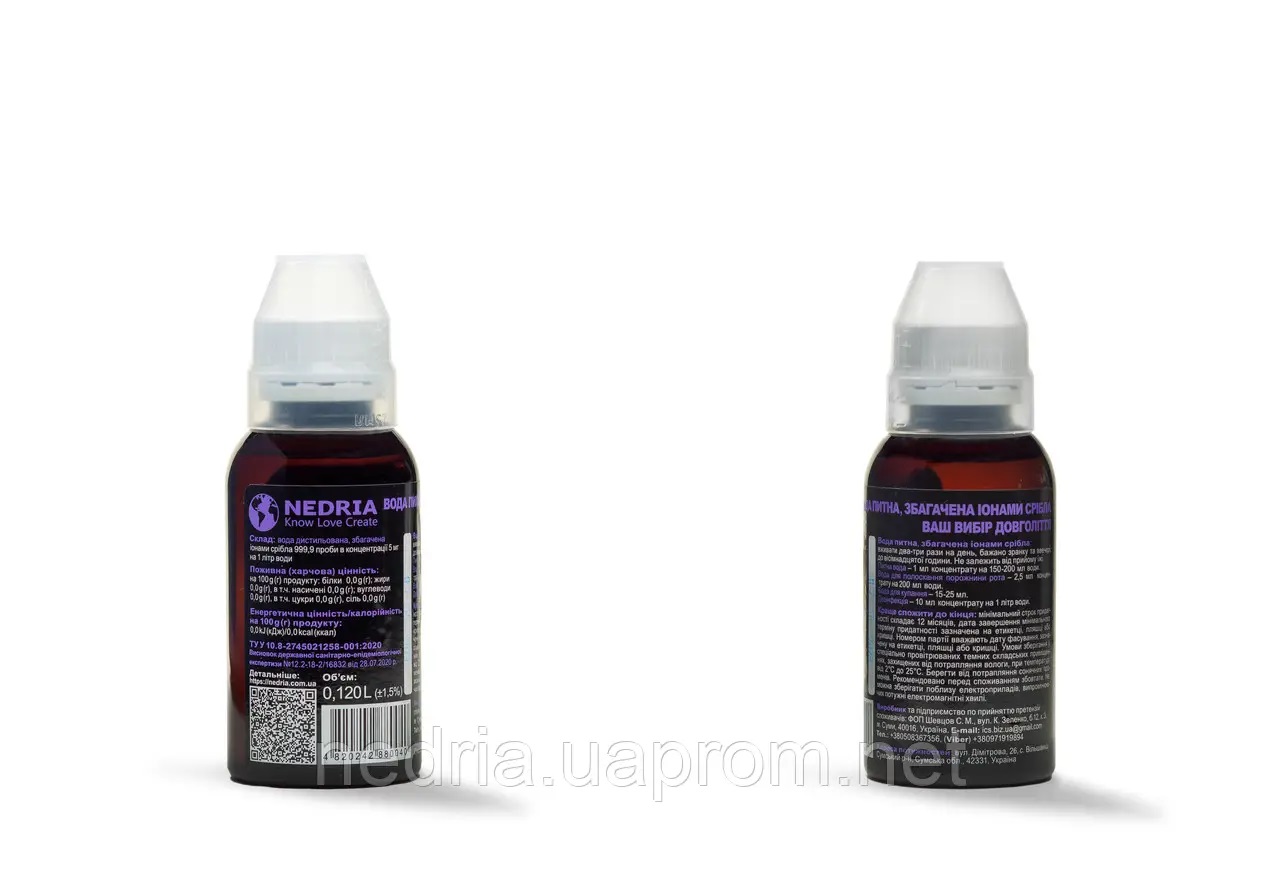 Колоїдне срібло Nedria – це демінералізована вода, збагачена іонами срібла, в концентрації 5 мг. срібла на 1 літр води. (Концентрат)