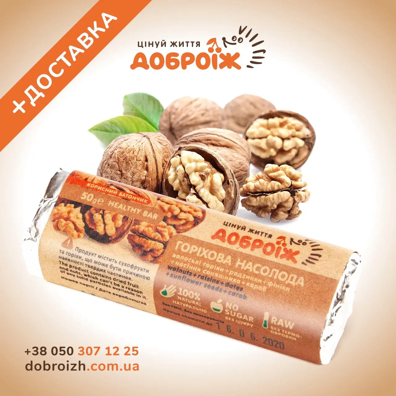 Саме цей принцип надихнув нашу компанію на створення батончиків ТМ «ДоброЇж». У поєднанні сухофруктів, горіхів, насіння та прянощів наші фахівці розробили унікальні рецепти ласощів. Для їх виготовлення використовують виключно натуральні компоненти , які не піддаються тепловій обробці, виготовлені технологією холодного пресингу, внаслідок чого не руйнуються їхні корисні властивості. Без цукру, консервантів, барвників, ГМО та синтетичних домішок. 18 різних смаків!