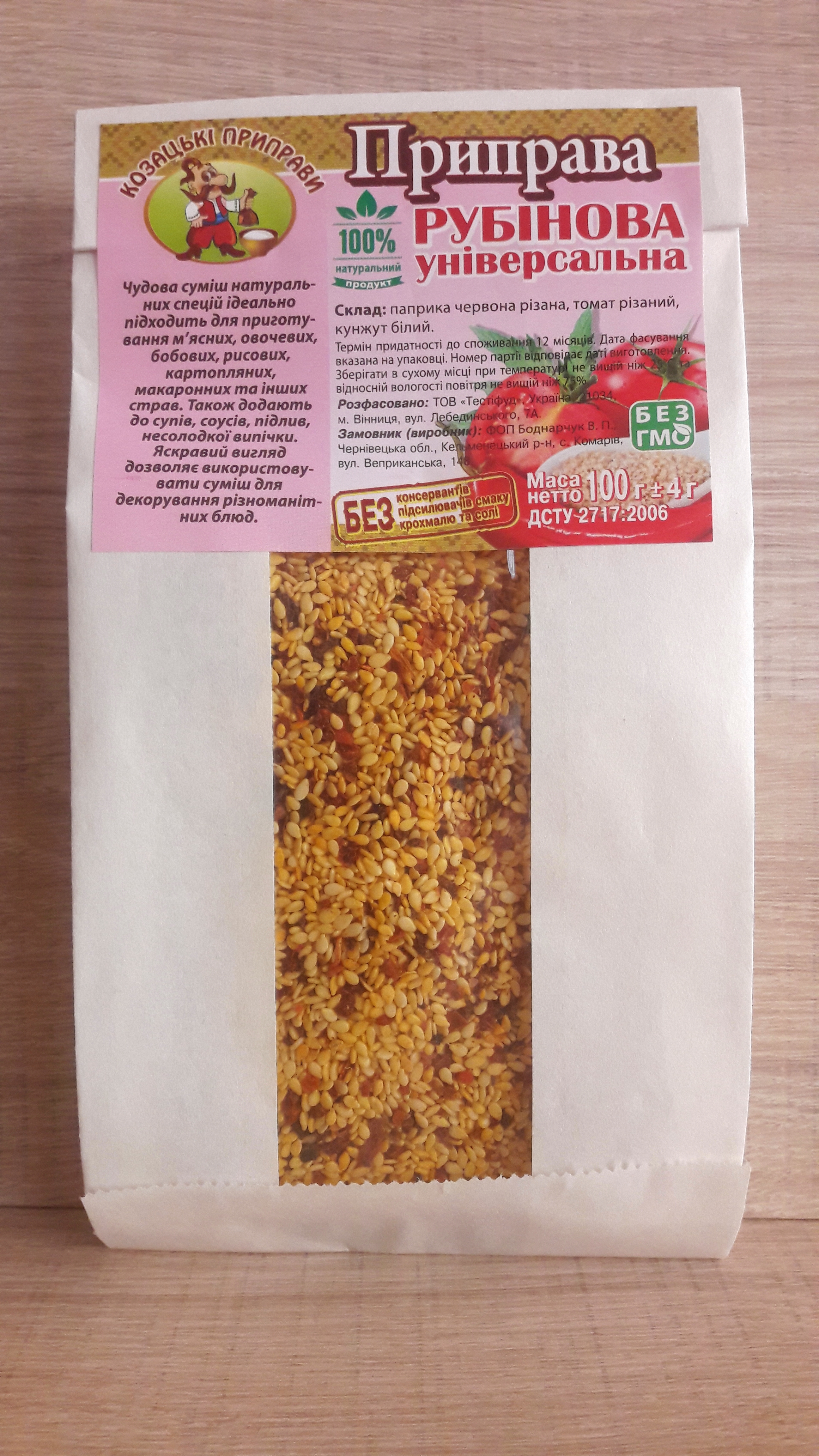 Козацька приправа Рубінова універсальна — чудова суміш натуральних спецій ідеально підходить для приготування м’ясних, овочевих, бобових, рисових, картопляних, макаронних та інших страв. Також додають в супи, соуси, підлив, несолодкої випічки. Яскравий вид дозволяє використовувати суміш для декорування різних страв.