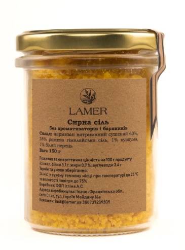 Склад: пармезан витриманий сушений 60%, гімалайська сіль, куркума, білий перець
